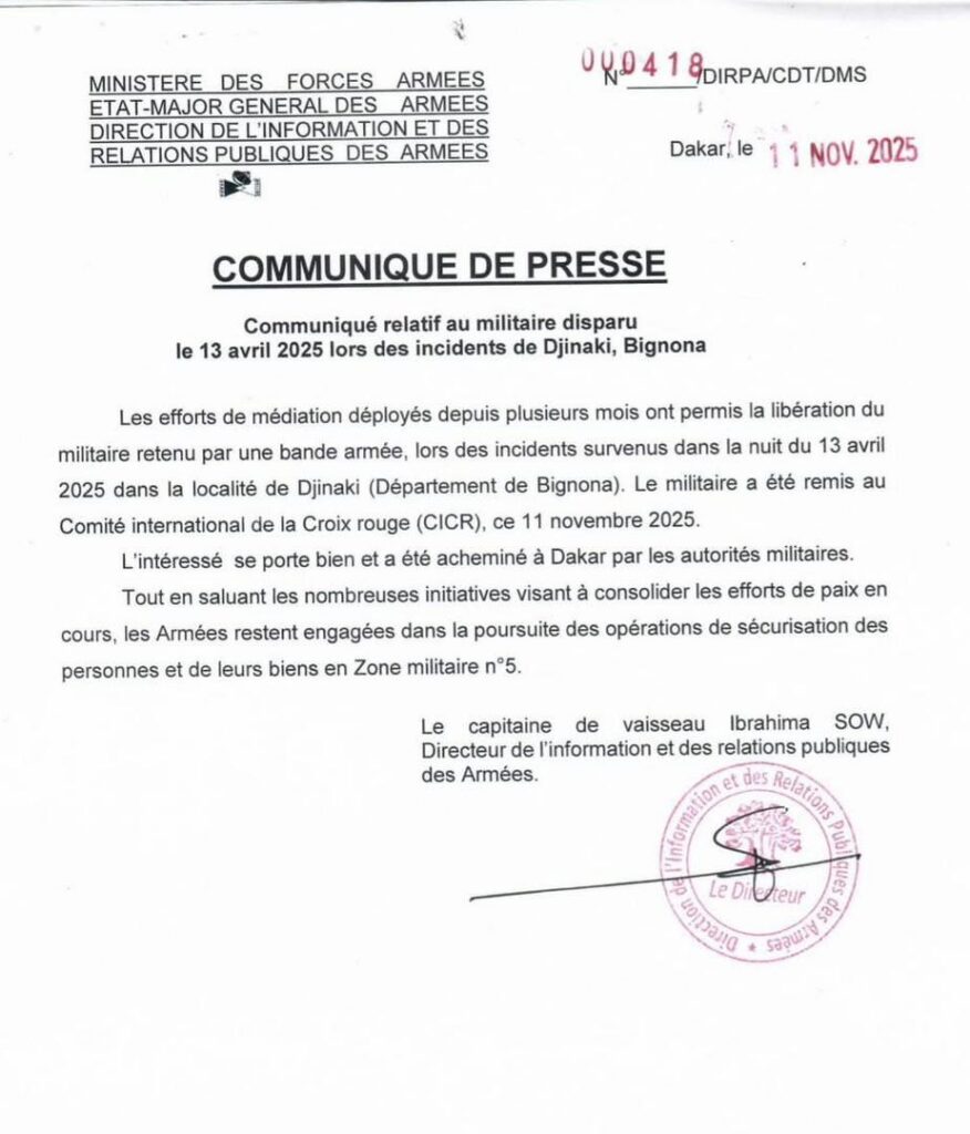 ARMEES : (Document) Le militaire disparu enfin remis à l’armée via la Croix Rouge