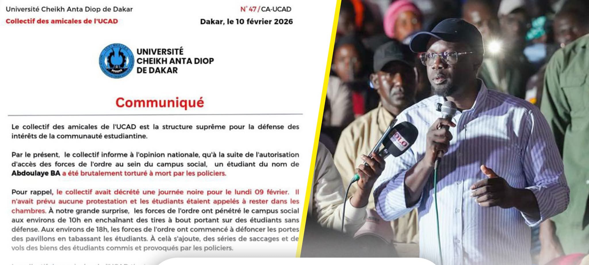 Par le présent, le collectif informe à l’opinion nationale, qu’à la suite de l’autorisation d’accès des forces de l’ordre au sein du campus social, un étudiant du nom de Abdoulaye BA a été brutalement torturé à mort par les policiers.
