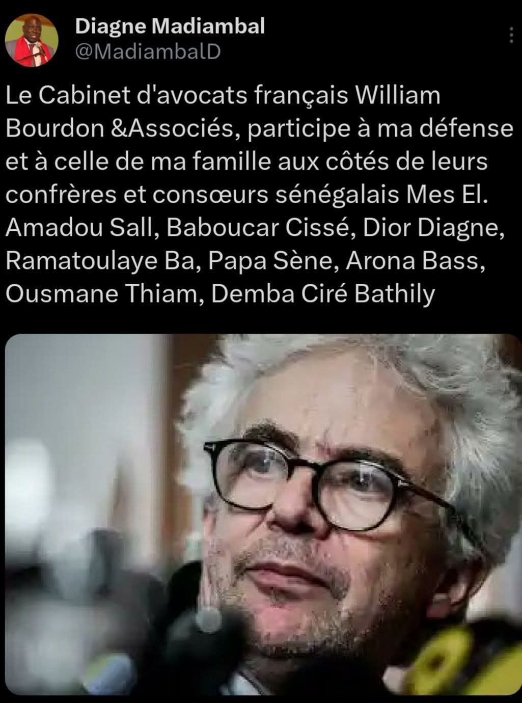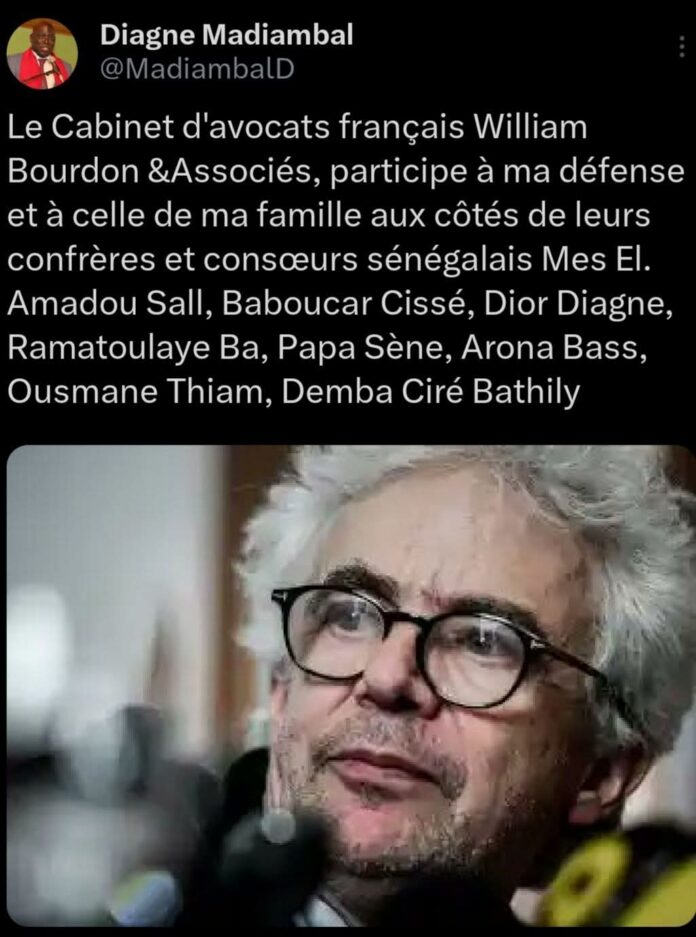 « Le Cabinet d’avocats français William Bourdon &Associés, participe à ma défense et à celle de ma famille aux côtés de leurs confrères et consœurs sénégalais Mes El. Amadou Sall, Baboucar Cissé, Dior Diagne, Ramatoulaye Ba, Papa Sène, Arona Bass, Ousmane Thiam, Demba Ciré Bathily » à tweeté Madiambalba Diagne