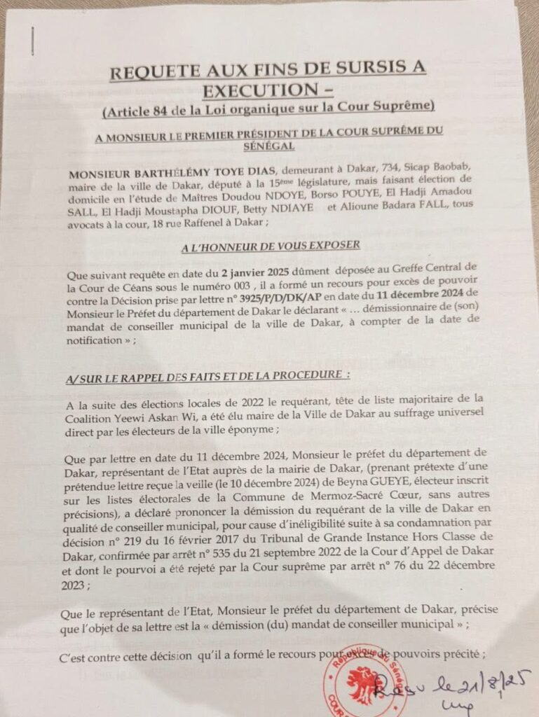 MAIRIE DE DAKAR : (Documents) Les conseils de Barth introduisent une requête de sursis à exécution, vers un report….